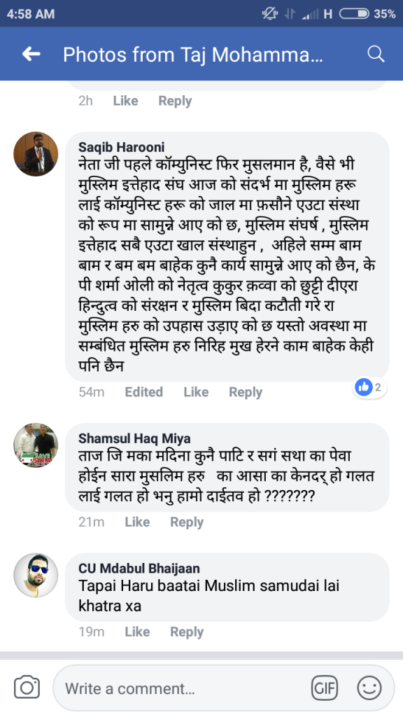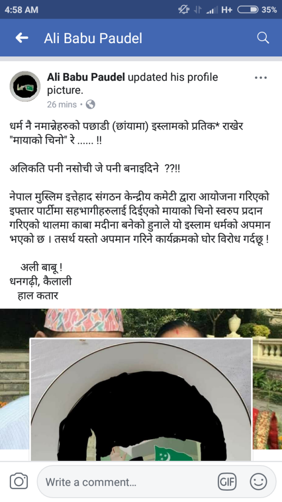 उपप्रधानमन्त्री तथा रक्षा मन्त्री ईश्वर पोखरेल, माधव कुमार नेपाल लगायत एमालेका नेताहरुको फोटो छापेर पृष्ठभुमिमा मक्का मदीनाको फोटो राखिएको थियो।