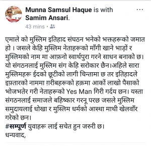 धार्मिक आस्थाको चरम दुरुपयोग गरिएको तथा इस्लाम धर्मको अपमान भएको भन्दै सामाजिक सन्जालमा इत्तेहाद संगठनले तत्काल माफी माग्नु पर्ने माग उठेको छ।