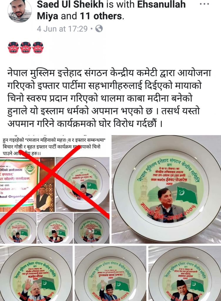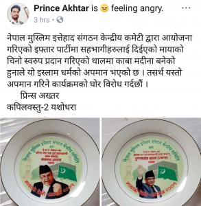 संगठनले आयोजना गरेको इफ्तार कार्यक्रममा मक्का मदीनालाई प्लेटको पृष्टभुमिमा पारेर नेताहरुको फोटो राखिएको विषयलाई लिएर चौतर्फी विरोध भएको हो।