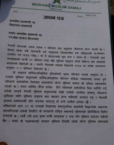 मोरंग मुस्लिम समाजले मुख्यमंत्री राई र ओली लाई ज्ञापन पत्र बुझाई आफ्नो पहिलो चरणको आंदोलन सम्पन्न गरेको छ ।भने दोस्रो चरणको आन्दोलनको कार्यक्रम सार्वजनिक गरेको छैन ।