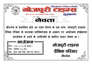 मध्य तराईको वीरगंजबाट प्रकाशित हुदै आएको भोजपुरी टाइम्स दैनिक पत्रिकाको आज चौथो वार्षिकोत्सव समारोहको उदघाटन गर्नु हुदै प्रमुख अतिथि मंजुर अंसारीले अन्य प्रदेशको तुलनामा दुई नम्बर प्रदेशको आफ्नै विशिष्टा रहेको भएपनि यस प्रदेशलाई अगाडि बढन नदिन पुरातन खसवादी सोंच भएका कर्मचारीहरु लागि रहेकोले त्यसलाई चिर्दै प्रदेशको आर्थिक सामाजिक र सांस्कृतिक विकासका लागि सञ्चारकर्मीहरुको भुमिका अझ पेचीलो हुनु पर्ने उल्लेख गर्नु भयो । २ नं। प्रदेशको इज्जत सान, मान र प्रतिष्ठालाई बचाउन भोजपुरी दैनिक पत्रिकाको योग्दान महत्वपूर्ण रहको चर्चा गर्नु हुदै बिधायक अंसारीले यहांको भोजपुरी सञ्चारमाध्यम भाषा, संस्कृति प्रति आफ्नोपन रहेकोले यसको उचाईको लागि आफनो तर्फबाट र प्रदेश नं। २ सरकारबाट हुने महत्पूर्ण सहयोग गर्ने उदघोष गर्नु भयो ।