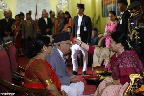 काठमाडौँ, २ कात्तिक ,, प्रधानमन्त्री केपी शर्मा ओलीले विजयादशमीको अवसरमा आफ्ना पिता मोहनप्रसाद ओलीबाट आज बिहान नौ बजेर ५१ मिनेटको शुभसाइतमा टीका, जमरा र तिलक ग्रहण गर्नुभयो । प्रधानमन्त्री निवासमा पिता ओलीले पुत्रवधु राधिका शाक्यलाई पनि टीका, जमरा र तिलक लगाइदिनुभएको प्रंधानमन्त्रीको निजी सचिवालयले जनाएको छ ।बाँकी अंश →
