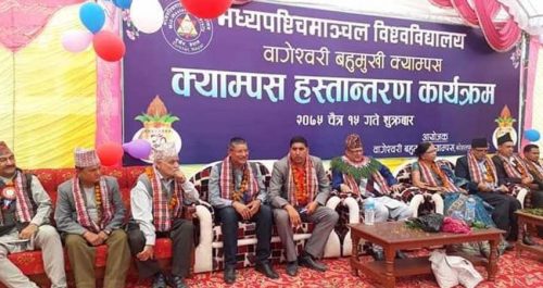 राँझा, १७ चैत ,, बाँकेको कोहलपुरस्थित बागेश्वरी बहुमुखी क्याम्पस मध्यपश्चिम विश्वविद्यालयको आङ्गिक क्याम्पसमा रुपान्तरण भएको छ । विसं २०७५ भदौ २२ गते नेपाल सरकार मन्त्रिपरिषद्ले बागेश्वरी क्याम्पसलगायत १० वटा क्याम्पसलाई आङ्गिक क्याम्पस बनाउने निर्णय गरे बमोजिम शुक्रबारदेखि बागेश्वरी बहुमुखी क्याम्पसले मध्यपश्चिम विश्वविद्यालयको सातौं आङ्गिक क्याम्पसको रुपमा मान्यता पाएको हो ।...बाँकी अंश →