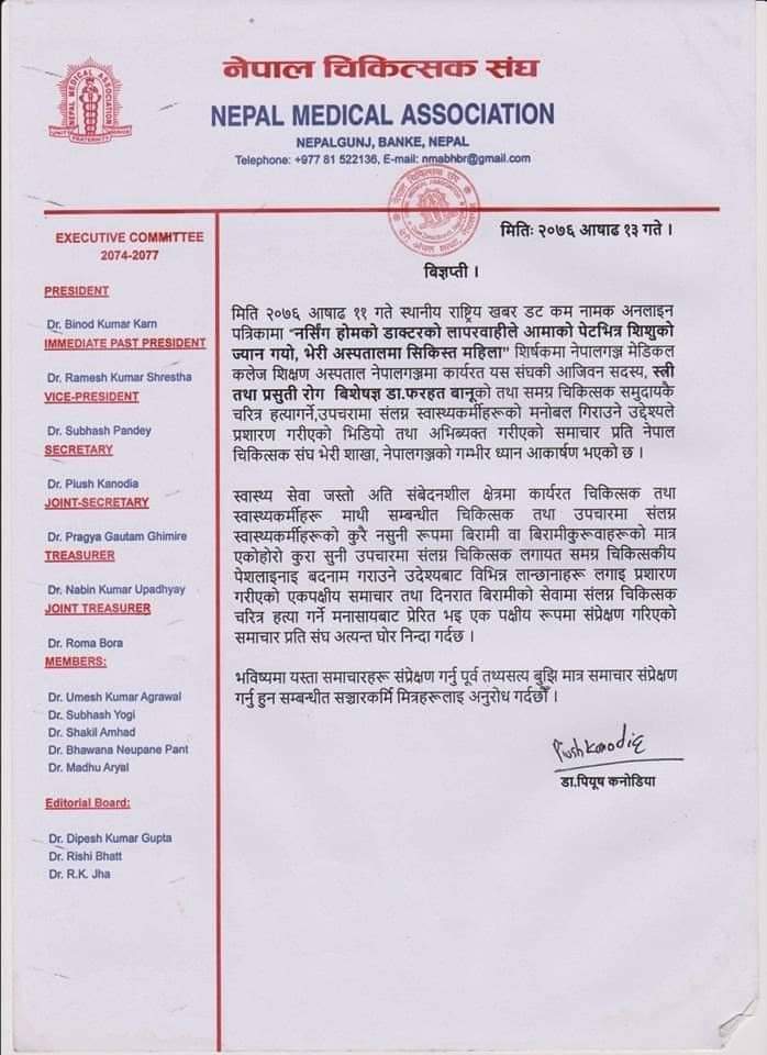 बाँके संवाददाता नेपाल चिकित्सक संघ बाँकेले समाजिक सञ्जालमा आएको समाचार प्रति ध्यानाकर्षण भएको भन्दै विज्ञप्ती जारी गरेको छ । संघका सचिव डा. पियुष कनोडियाद्वारा हस्ताक्षरित बिज्ञप्तीमा सञ्जालमा आएको गलत समाचार प्रति आफनो ध्यानाकर्षण भएको भन्दै त्यो कार्यले निस्वार्थ रुपले बिरामीको सेवामा लागेका चिकित्सकहरुको मनोबल गिराउने काम भएको उल्लेख छ ।...बाँकी अंश →