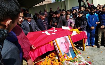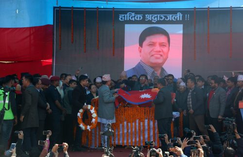 पोखरा, १७ फागुन ,, हेलिकप्टर दुर्घटनामा निधन हुनुभएका संस्कृति, पर्यटन तथा नागरिक उड्डयनमन्त्री रवीन्द्रप्रसाद अधिकारीको शव यात्रा पोखरामा अहिले शुरु भएको छ । प्रदर्शनी केन्द्रबाट शुरु भएको शव यात्रामा उपप्रधानमन्त्री एवं रक्षामन्त्री ईश्वर पोखरेल, श्रम रोजगार तथा सामाजिक सुरक्षामन्त्री गोकर्ण विष्ट, भूमी व्यवस्था, सहकारी तथा गरीबी निवारणमन्त्री पद्ममा अर्याल, गण्डकी...बाँकी अंश →