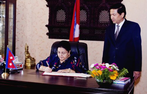 काठमाडौँ, १० फागुन ,, राष्ट्रपति विद्यादेवी भण्डारीले सङ्घीय संसद्का दुवै सदनको बैठकबाट पारित तीन वटा विधेयक प्रमाणीकरण गर्नुभएको छ । नेपालको संविधानको धारा ११३ को उपधारा (२) बमोजिम राष्ट्रपतिले ती विधेयक प्रमाणीकरण गर्नुभएको हो । राष्ट्रपतिबाट आज राष्ट्रिय चिकित्सा शिक्षा सम्बन्धमा व्यवस्था गर्न बनेको विधेयक, २०७५, सङ्कटापन्न वन्यजन्तु तथा वनस्पतिको...बाँकी अंश →