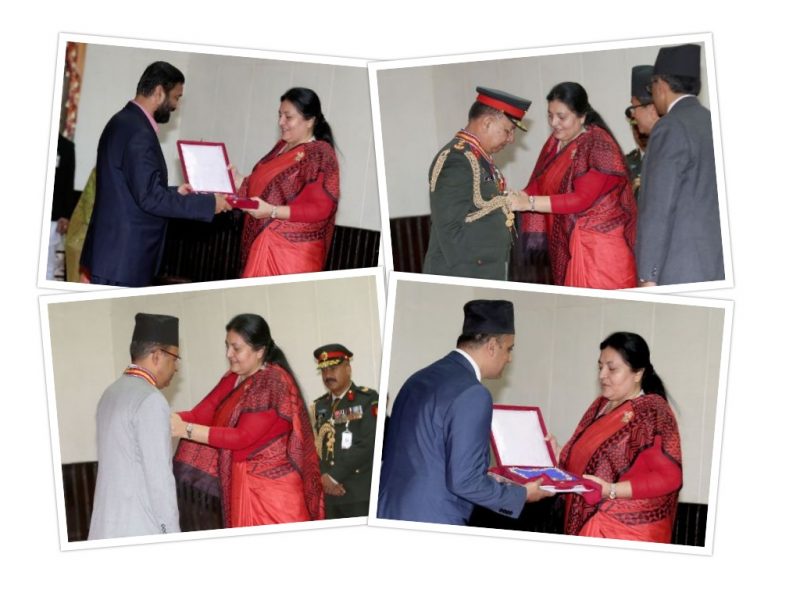 काठमाडौँ, १९ भदौ ,, राष्ट्रपति विद्यादेवी भण्डारीले समाजका विभिन्न क्षेत्रमा उत्कृष्ट योगदान पु¥याउनुभएका विभिन्न व्यक्तित्वलाई आज विभिन्न विभूषण एवं मानपदवीबाट विभूषित गर्नुभएको छ । गत वर्ष २०७४ को गणतन्त्र दिवसका दिन घोषणा भएका विभिन्न दश प्रकारका मानपदवी ३४५ जनालाई आज प्रदान गरिएको हो । राष्ट्रपति कार्यालय शीतल निवासमा आज गृह...बाँकी अंश →