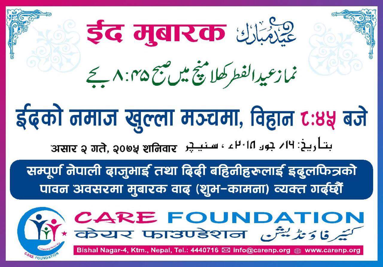 Care khabar , kathmandu नेपाल लगायत बिश्वमा छरिएर रहेका इस्लाम धर्मावलम्बीहरुको इशभय बढाउने , एकताको सन्देश दिने ,न्यायिकता ,सद्भाव,इमानदारिता, दान गर्ने महान चाडपर्व ईदुल फ़ितरः को अवसरमा केयर फाउंडेशन ,केयर खबर, केयर ह्युमन राइट , एस टुगेदर वी क्यान, अहमद बिन हम्बल लगायत संघ संस्थाहरूले मुस्लिम समुदायलाई शुभकामना दिएका छन ।...बाँकी अंश →