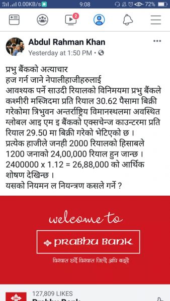 काठमाडौँ, ५ साउन. केयर खबर संवाददाता . हजयात्रामा साउदी गई रहेका हजयात्रीहरू सँग रियाल साटासाट गर्ने क्रममा प्रति रियालमा एक रुपैया १२पैसा ठगिएका छन । हिजो साउन ४ गते सम्म प्रभु बैंकले ३० रुपैया ६२ पैसाको विक्री दरले साटासाट गरेको थियो । जबकी साउन एक गते देखि प्रभु बैंक ले...बाँकी अंश →