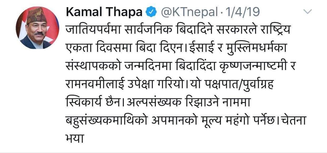राप्रपा अध्यक्ष कमल थापाले ट्विट गरेर मुहम्मद दिवसको दिनमा सरकारले प्रस्तावको रूपमा ल्याएको सार्वजनिक बिदाको बिरोध गरेको भन्दै पूर्व मन्त्री मोहम्मद जाकिर हुसैनले आपत्ति जनाएका छन् । पूर्व महिला, बालबालिका तथा समाज कल्याण राज्यमन्त्री हुसैनले “हुन त विदा पुनस्र्थापना भएको निर्णय सरकारले गरिसकेको छैन तर हिजो ईद, बक्रईद, मुहम्मद...बाँकी अंश →