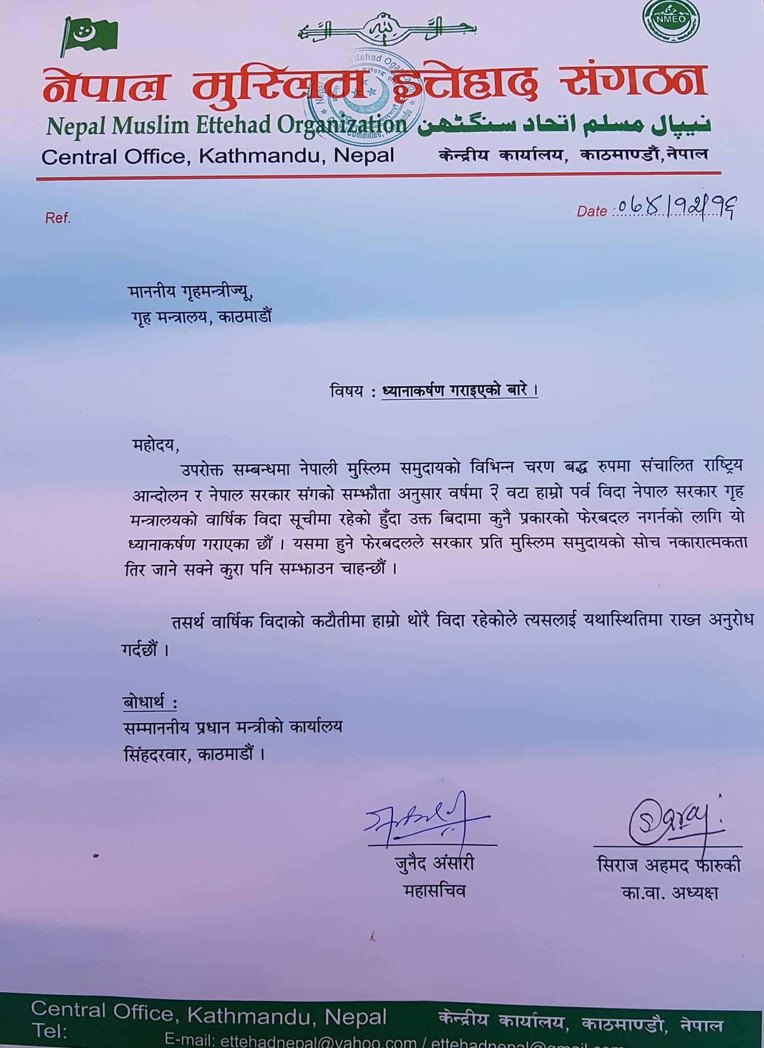 बर्तमान सरकारले बिदा हरु लाई कटौती गर्ने क्रम मा मुस्लिम समुदायको ३ सरकारी बिदा पनि कटौती गरेको छ । शुक्रवार एमाले निकट नेपाल मुस्लिम इत्तिहाद संग़ठन ले गृहमंत्री लाई मुस्लिम समुदायले आंदोलन को प्रतिफल मा पाएको ३ पर्व बिदा लाई यथास्थिति राख्न ध्यानाकर्षित गराएको छ । मुस्लिम समुदायले मनाउने...बाँकी अंश →