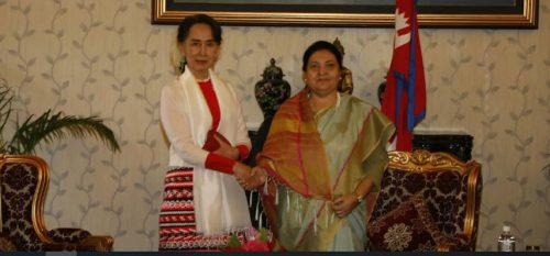 काठमाडौँ, १४ मङ्सिर ,,  राष्ट्रपति विद्यादेवी भण्डारीसँग नेपालको औपचारिक भ्रमणमा रहनुभएका म्यान्माका स्टेट काउन्सिलर आङ सान सु कीले भेटवार्ता गर्नुभएको छ । राष्ट्रपति कार्यालय शीतल निवासमा आज बिहान भएको सो भेटमा द्विपक्षीय आपसी हितका विविध विषयमा कुराकानी भएको थियो । भेटवार्तामा राष्ट्रपति कार्यालय एवं परराष्ट्र मन्त्रालयका उच्च अधिकृतको सहभागिता रहेको...बाँकी अंश →