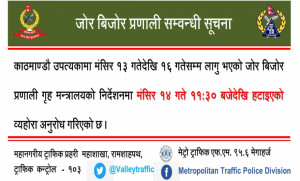 काठमाडौँ, १४ मङ्सिर,,   काठमाडौँ उपत्यकामा चल्ने सवारीसाधनलाई लगाइएको जोरबिजोर प्रणाली हटाइएको छ । गृह मन्त्रालयको निर्देशनमा महानगरीय ट्राफिक प्रहरी महाशाखाले मङ्सिर १३ देखि १६ गतेसम्म लगाएको जोरबिजोर प्रणाली आज बिहान ११ः३० बजेदेखि हटाएको हो । मङ्सिर १३ देखि १७ गतेसम्म काठमाडौँमा आयोजना गरिएको एशिया प्रशान्त सम्मेलनमा भागलिन विभिन्न देशका सरकार...बाँकी अंश →