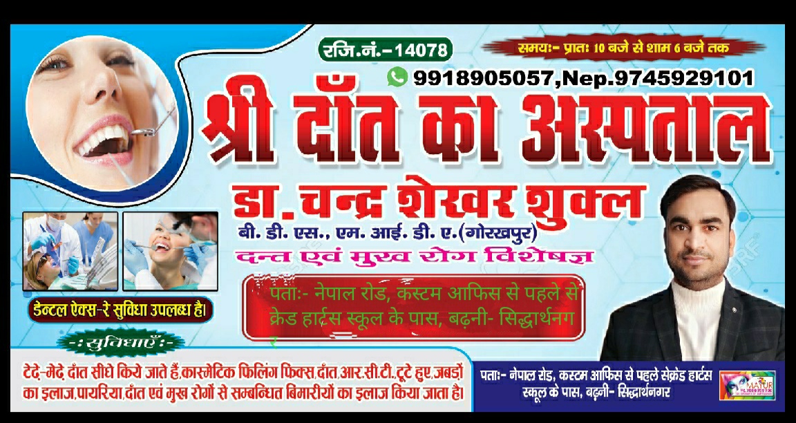 कृष्णनगर, कपिलवस्तु , मंसिर २१ कपिलवस्तु जिल्लाको कृष्णनगर सँग नजिकै रहेको बजार भारतको सिद्धार्थनगर जिल्लाको बढ्नीमा सुविधा सम्पन्न श्री दाँतका अस्पताल सञ्चालनमा रहेको छ l दाँत एवम् मुख रोग सम्बन्धी राम्रो ज्ञान भएका दक्ष तथा अनुभवी डा. चन्द्र शेखर...बाँकी अंश →