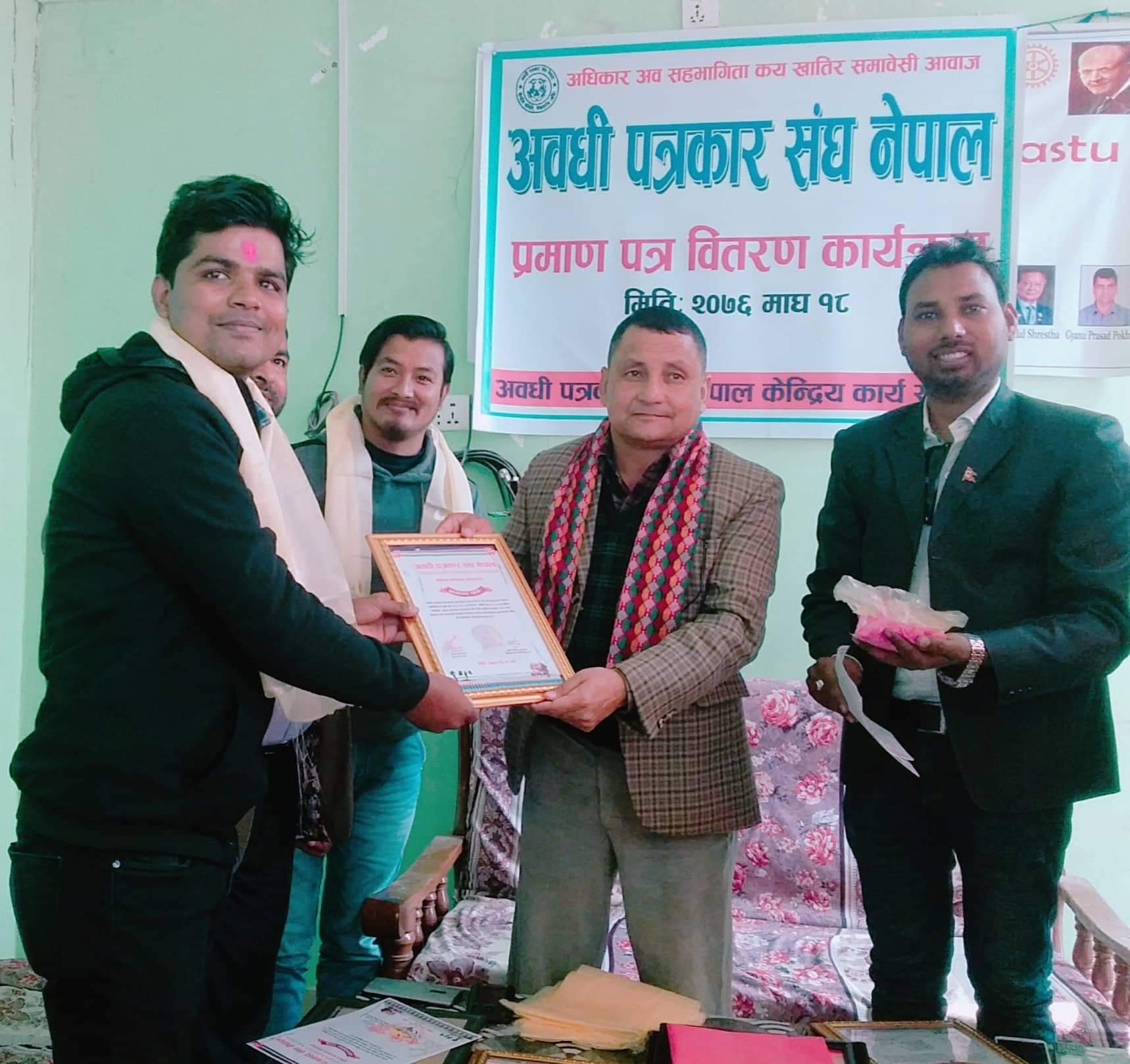 कपिलवस्तु माघ १८, भाषा संरक्षणमा पत्रकारको भुमिका महत्वपुर्ण रहेको प्रदेश नं ५ का प्रदेश सांसद अर्जुन कुमार केसीले बताउनु भएको छ । अवधी पत्रकार संघ नेपालको नव निर्वाचित पदाधिकारीहरुलाई प्रमाण पत्र वितरण कार्र्यक्रममा बोल्दै प्रदेश सभा सदस्य केसीले अवधी भाषा मधुर, मिठासको खानी रहेको बताउनु भयो । उहाले भाषा, कला,...बाँकी अंश →