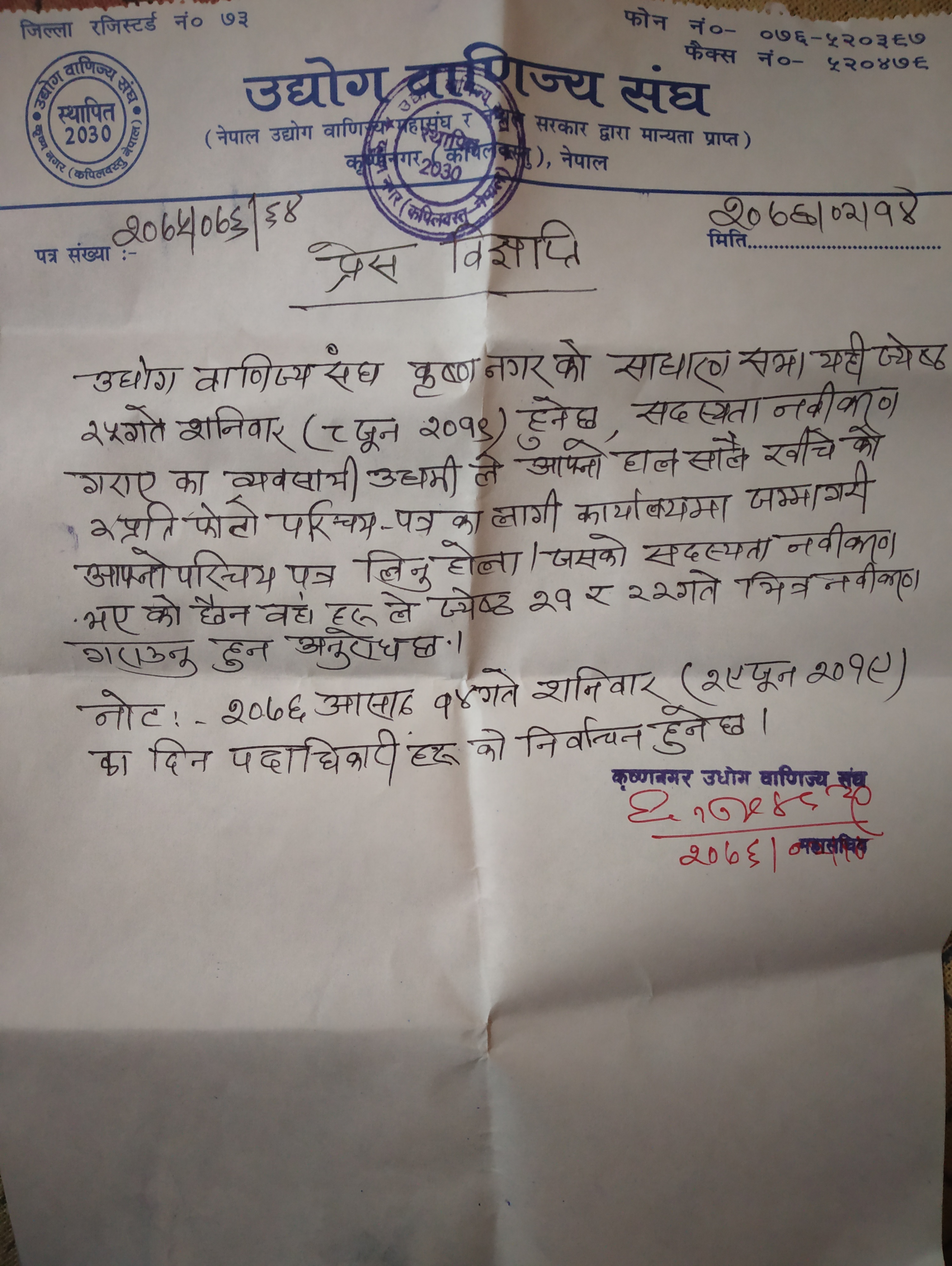 कृष्णानगर संवाददाता/ कपिलवस्तु जेठ १४ उद्योग वाणिज्य संघ कृष्णानगर ले प्रेस विज्ञप्ति मार्फत उद्योग वाणिज्य संघ कृष्णानगरको साधारण सभा यही जेठ २५ गते शनिवार (८ जून २०१९) मा हुने भएको छ। सदस्यता नवीकरण गराएका व्यवसायी र उद्यमी हरूले आ-आफ्नो २ प्रति फोटो परिचय पत्र का लागी उद्योग वाणिज्य संघ...बाँकी अंश →