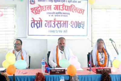 जय बर्मा, कपिलबस्तु । असार २५ । कपिलबस्तुको पुर्ववर्ती क्षेत्रमा अवस्थित शुद्धोधन गाउपालिकाको निती, कार्यक्रम तथा बजेट पारित गर्दै तेस्रो गाउसभा सम्पन्न भएको छ । आगामी आर्थिक वर्ष २०७५÷७६ को लागि कुल रु. ४० करोड ३८ लाख ९५ हजार रुपैयाँ बजेट प्रस्ताव सहित गाउसभा सम्पन्न भएको हो । गाउपालिकाका उपाध्यक्ष...बाँकी अंश →