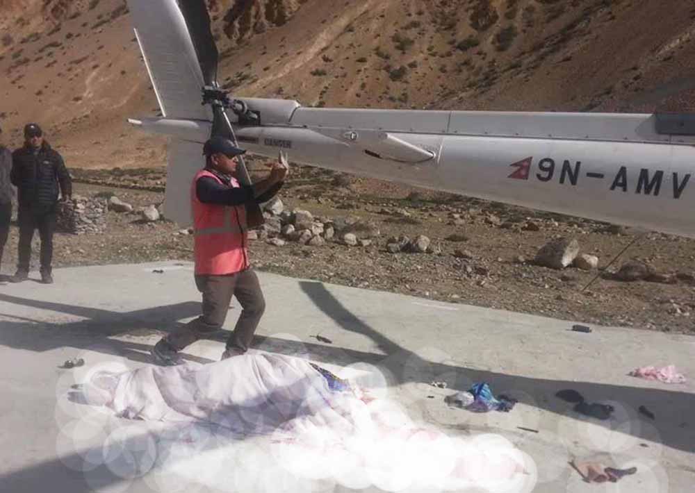 सुर्खेत, ३० साउन , मनाङ एयरको हेलिकप्टरको पङ्खा लागेर हिल्सामा मृत्यु भएका भारतीय नागरिकलाई उनकै देशमा लगिने भएको छ । मुम्बईका ४२ वर्षीय नगेन्द्रकुमार कार्तिक मेहताको मङ्गलबार हिल्सामा हेलिकप्टरबाट ओर्लेर सेल्फी खिच्ने क्रममा पछाडिको पङ्खा लागेर मृत्यु भएको थियो । मेहताको शव मङ्गलबार नै हिल्साबाट सिमकोट पु¥याइएको जिल्ला प्रहरी कार्यालय...बाँकी अंश →