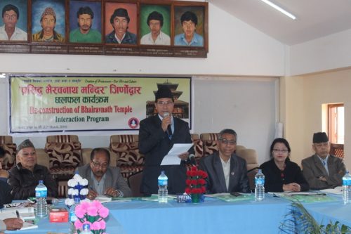भादगाउँ, १९ असोज,, भक्तपुरको टौमढीस्थित प्रसिद्ध भैरवनाथ मन्दिरको जीर्णोद्वार शुरु गरिएको छ । विसं २०७२ को विनाशकारी भूकम्पले क्षतिग्रस्त सो मन्दिर भक्तपुर नगरपालिकाले जीर्णोद्धार शुरु गरेको हो । नगरपालिकाले न्हुछेराम भेलेको अध्यक्षतामा गठन भएको उपभोक्ता समितिमार्फत सो मन्दिरको जीर्णोद्वार शुरु गरेको हो । पहिलो चरणमा मन्दिरको माथिल्लो छानाको जीर्णोद्वार गरिनेछ...बाँकी अंश →