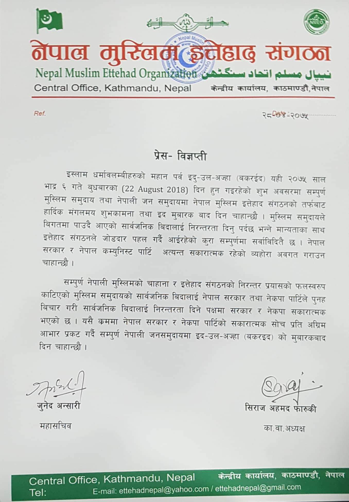 नेपाल मुस्लिम इत्तिहाद संगठनले श्रावन २८ गते बिज्ञप्ति जारी गर्दै ईद र बक़रीद बिदालाई सार्वजनिक राष्ट्रीय बिदाको रुपमा स्थापित गर्न नेपाल कम्युनिस्ट पार्टी सकारात्मक रहेको ठहर गरेको छ । जारी बिज्ञप्तिमा सरकार तथा ने क प पुनः बिचार विमर्श गरी समुदायिक बिदा बाट राष्ट्रीय सार्वजनिक बिदाको रुपमा निरन्तर स्थापित गर्न...बाँकी अंश →